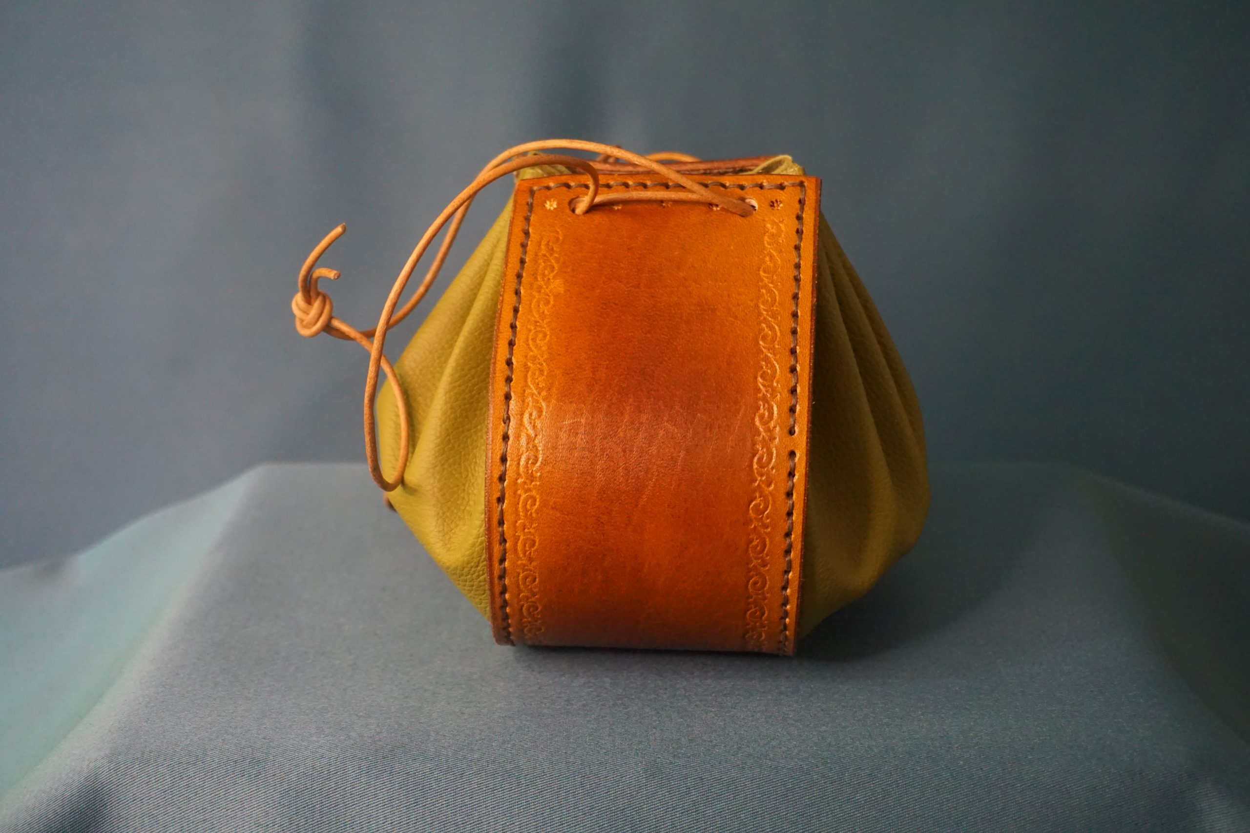 Bourse en cuir faite à la main. Le cuir est de couleur verte et marron.